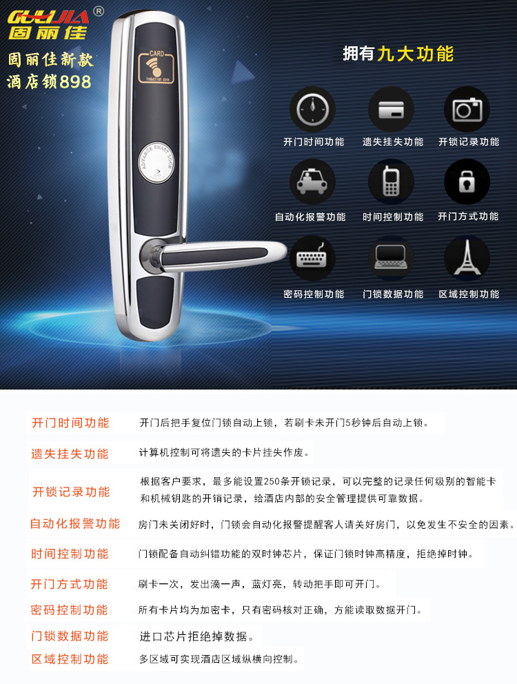 酒店鎖之所以能成為目前暢銷的一個(gè)鎖具,它的功能強(qiáng)大是一種原因,外觀設(shè)計(jì)也是一個(gè)吸引人的重要原因。選擇酒店鎖的人,喜歡的是他精美設(shè)計(jì)的外觀,具有非常時(shí)尚的大氣感,利用感應(yīng)功能,能夠方便開啟,無需攜帶機(jī)械鑰匙。作為日趨智能化的今天,無論是家具,酒店,還是辦公場所大家都在往使用酒店鎖的趨勢(shì)上邊發(fā)展,固麗佳致力于讓智能鎖走進(jìn)千家萬戶!